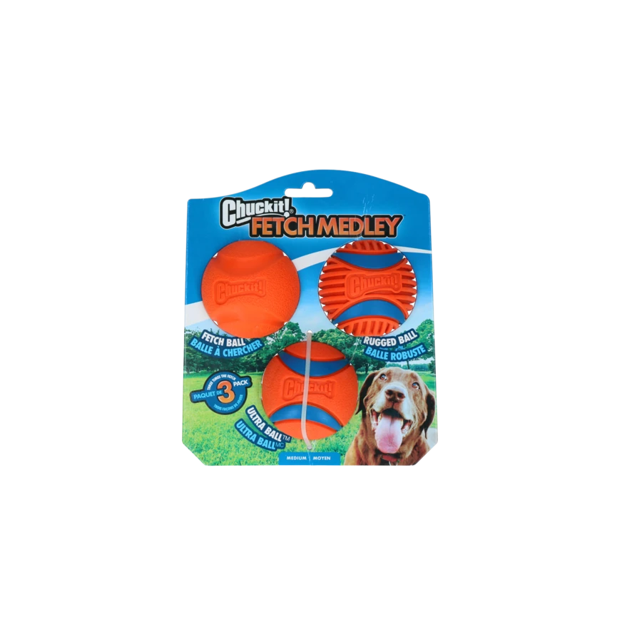 Drie verschillende Chuckit ballen die elk hun eigen eigenschappen hebben en uw hond blij zullen maken. De Ultraball stuitert het hoogst en heeft een hoog drijfvermogen. De Fetch Ball is perfect voor het gooien en de Rugged Ball is gemaakt voor het ruige werk. De ballen zijn allemaal gemaakt van duurzaam rubber en door de felle kleuren goed zichtbaar. Deze ballen hebben een medium formaat en passen daarom ook in de meeste medium launchers