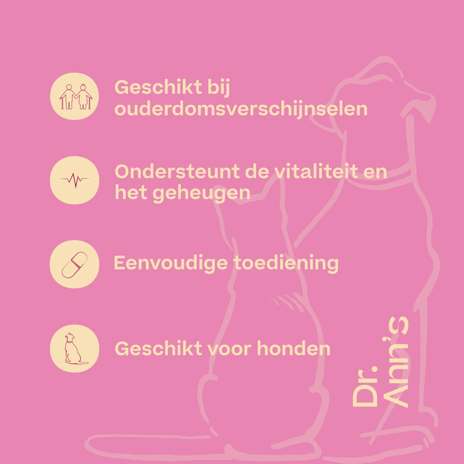 Dr. Ann’s Activate is een supplement voor honden. Het ondersteunt bij tekenen van ouderdom. Bij ouderdom raken de hersenen beschadigd door de vorming van vrije radicalen. Dit kan zorgen voor ouderdomsverschijnselen. Deze situatie kan leiden tot ongewenst gedrag zoals slapeloosheid en onzindelijkheid.