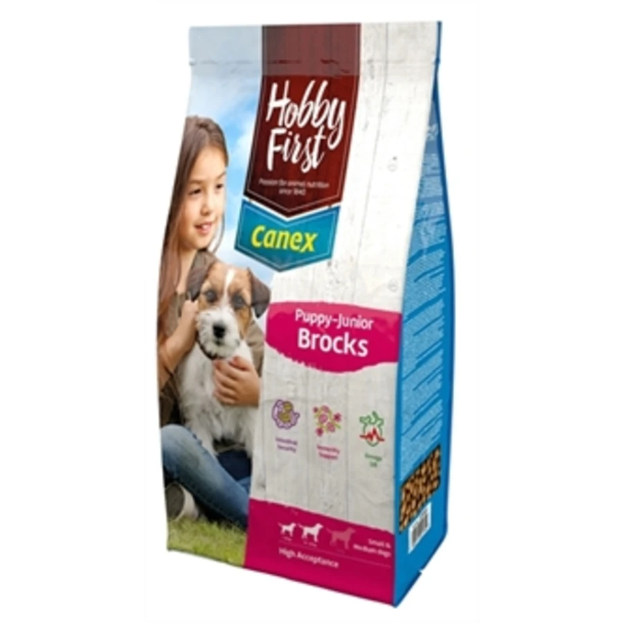 HobbyFirst Canex Puppy-Junior Brocks is een geëxtrudeerde hondenvoeding voor (opgroeiende) pups en junioren van kleine en middelgrote rassen. Het is voor pups in hun eerste groeifase, vanaf 4 weken. Puppy-Junior Brocks bevat een hoog aandeel gedroogde kip en rijst, dat maakt de voeding licht verteerbaar en bevordert een goede spijsvertering.