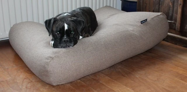 Het prachtige bed in een lichtbruine kleur Tweed. De hoes is gemaakt van grove wollen stof.