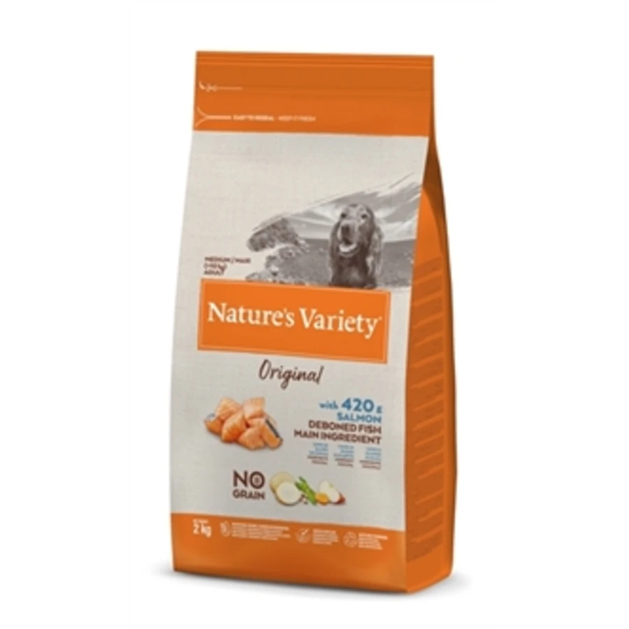 Nature’s Variety Original Adult Medium / Maxi Salmon No Grain 2 kg is een volledig en uitgebalanceerd droogvoer voor honden van middelgrote en grote rassen maanden, met ontbeende zalm als hoofdingrediënt aangevuld met zoete aardappel, fruit en groenten.